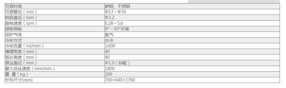 根據(jù)焊接工藝需要可選擇采用自熔、填絲或是先自熔后填絲等,操作方便、快捷、力可選擇立式或臣式焊接方式;夾具體可通過手搖動機身后(下)方的搖桿進行前后調節(jié);夾具體可通過手搖動機身側邊的搖桿進行左右調節(jié);驅動采用進口的直流電機,在轉速范圍內(nèi)無級調速。所有的水、電、氣管、線均無纏繞采用氣動夾景方式,使工件能夠牢牢地定位在工作臺上,無需人干予。采用冰冷G焊槍的標準結構形式:從后面向前頂緊鎢極夾達到夾景鎢極的目的,替換或調整鎢極方便快捷;送絲無纏繞,自帶一體式送絲機,可裝1.0kg裝盤,具有弧長和橫擺功能
